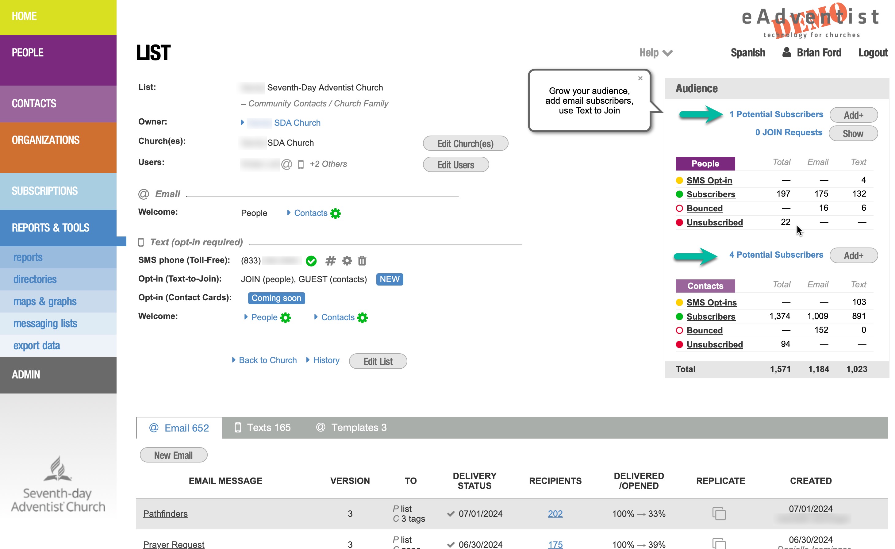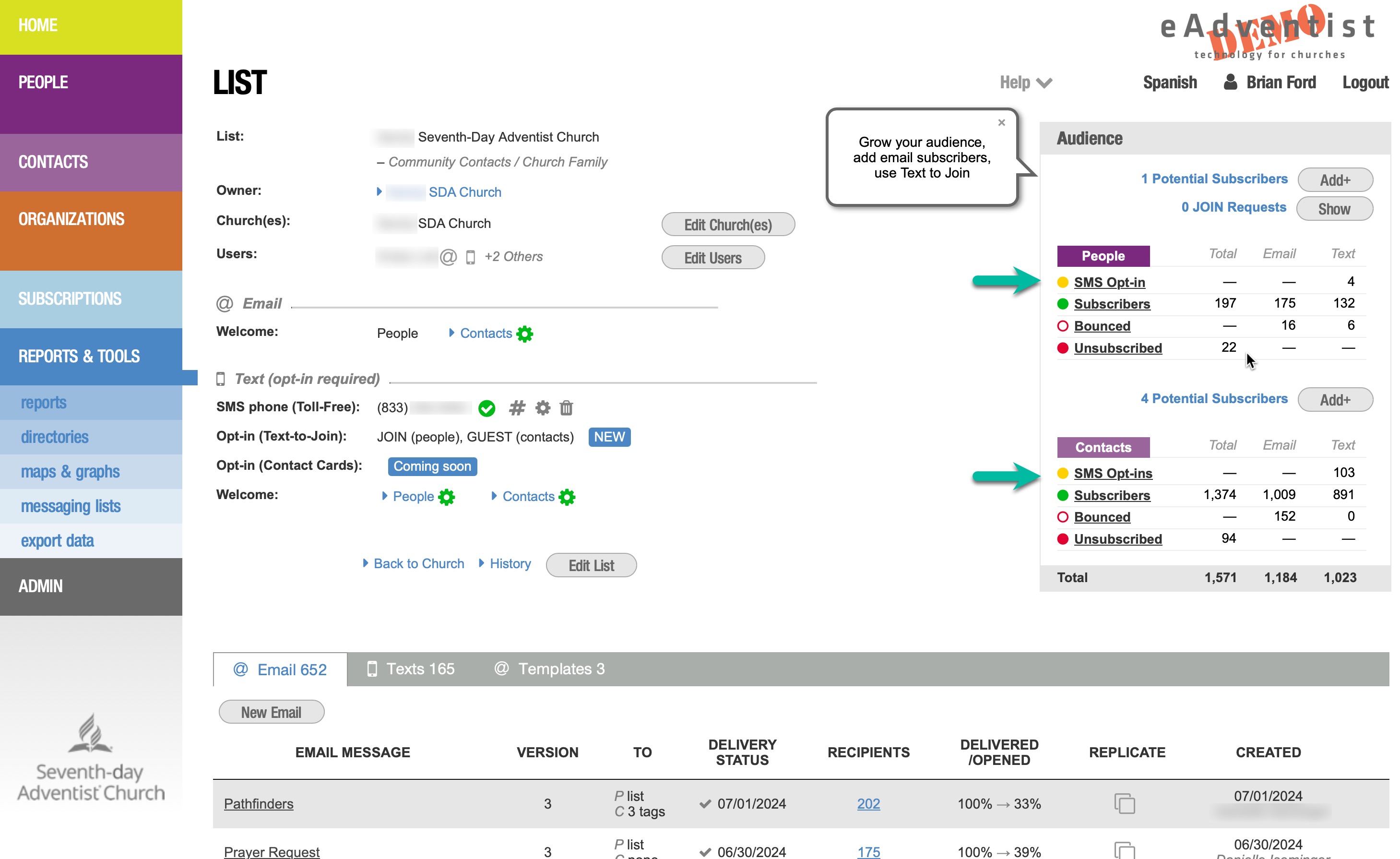 eAdventist will send a Welcome message to each Person or Contact that has opted-in.