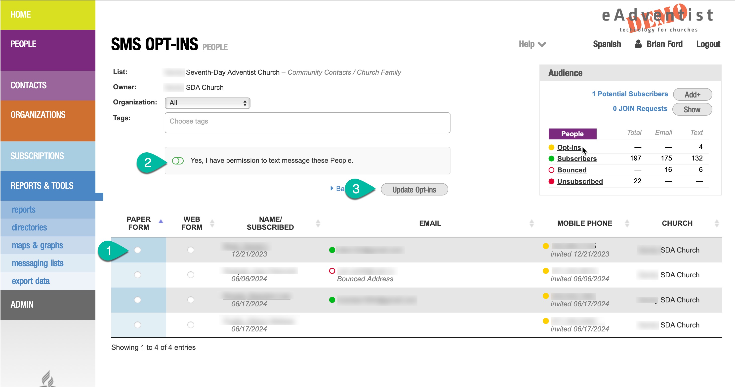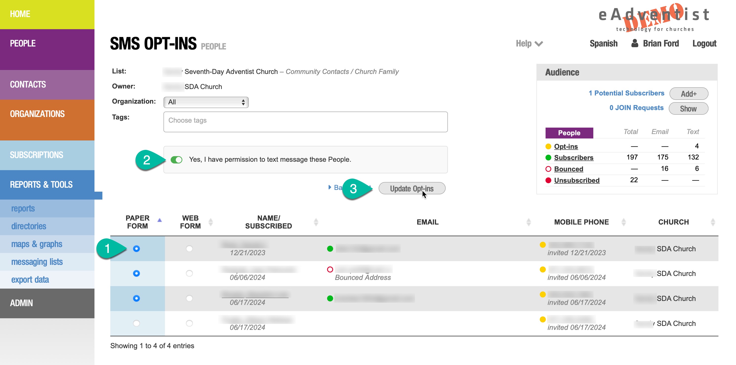 For each Subscriber that has a mobile phone number, you can (1) select the Opt-in method. To save these changes, (2) click the "Permission" toggle and (3) click the "Update Opt-ins" button.