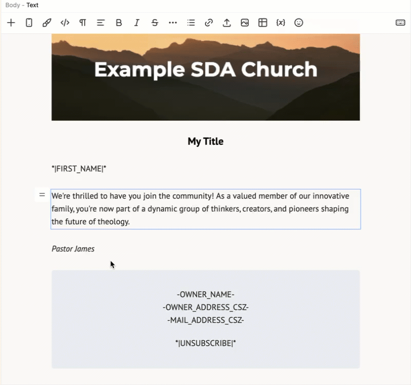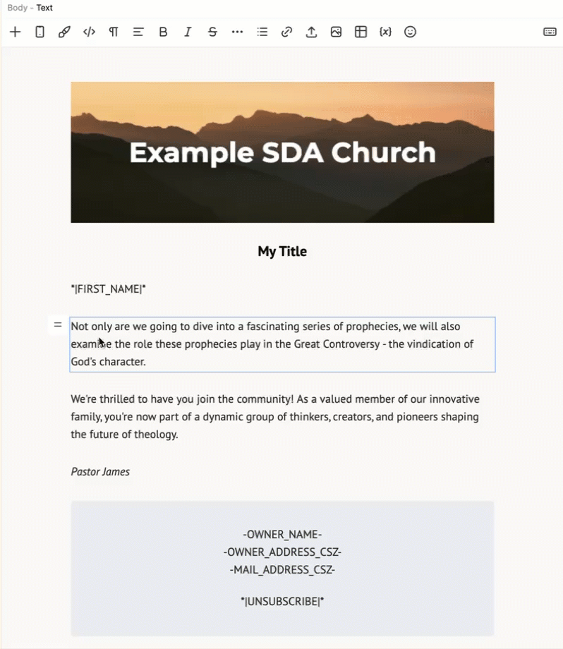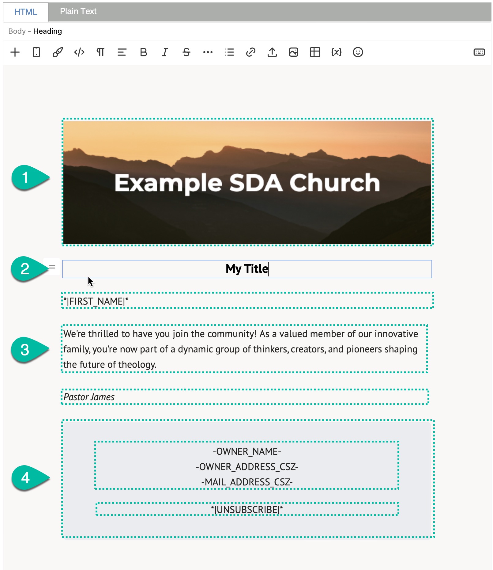 eAdventist's Version 4 email editor creates your message as a series of blocks. A typical message layout will include: