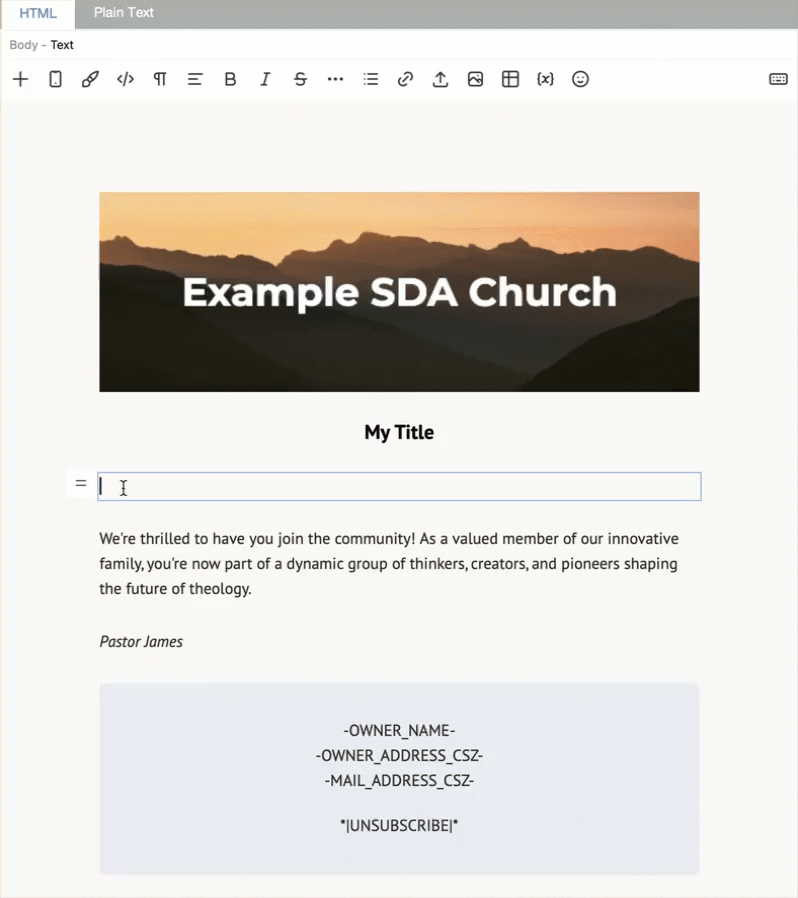 Click the "Variable" button in the toolbar to select a "Merge tag", which will be replaced with the recipient's information when the message is sent.