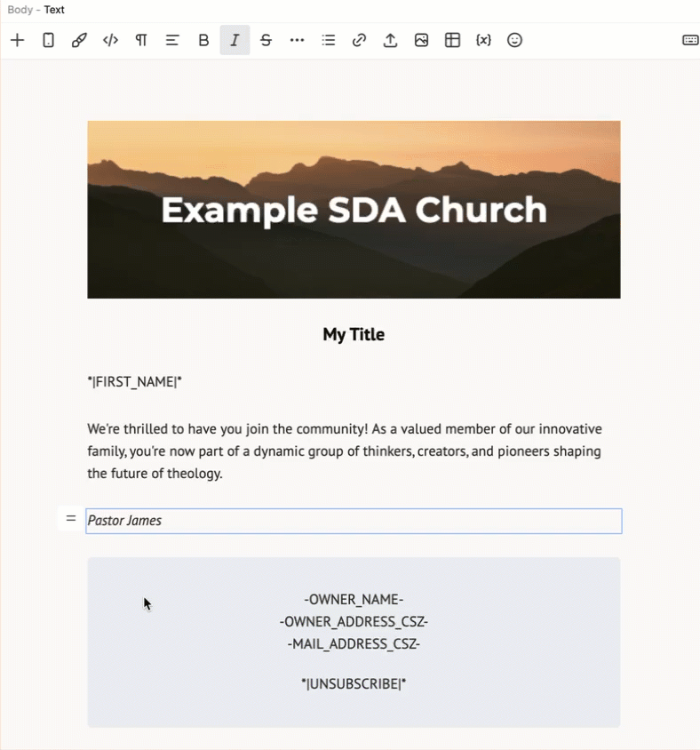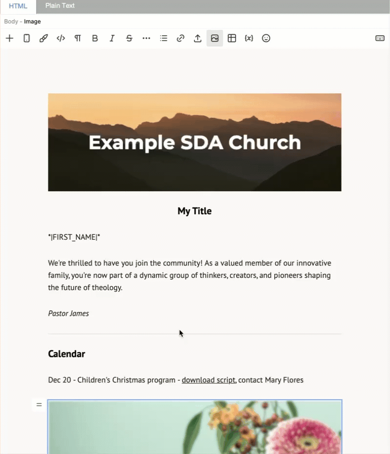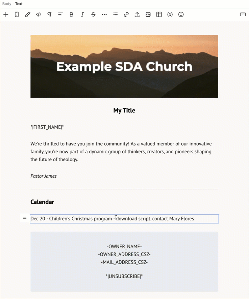eAdventist's Version 4 email editor allows you to add a Link to any text or image in your message. A Button is a special type of Link that serves as the CTA ("call to action") for your message.
