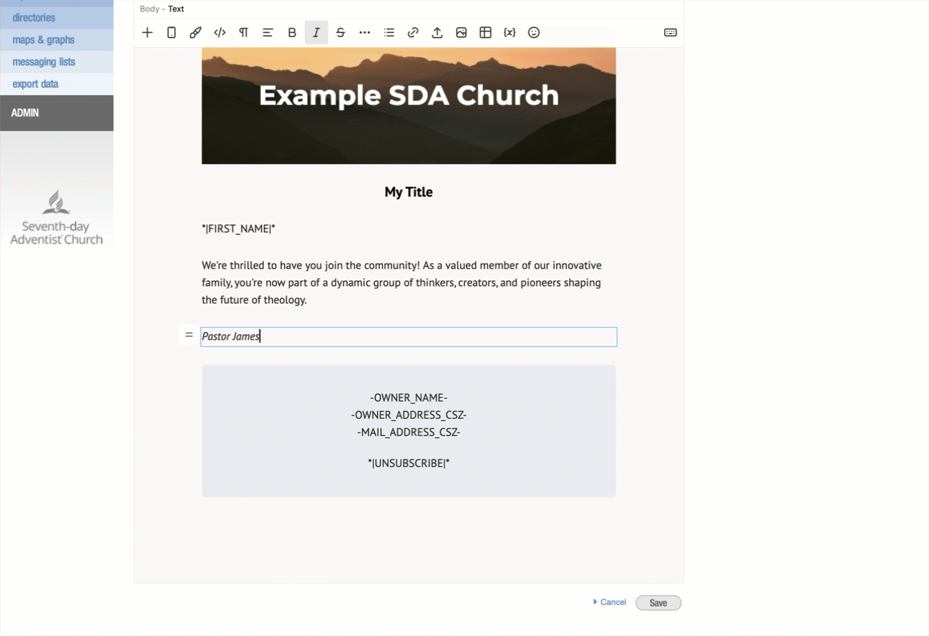 Video files are usually large and a video media server is the best way to host them. To include a video in an email message, add an image and create a link to the video on the hosting provider of your choice (e.g. Vimeo, YouTube, etc.).