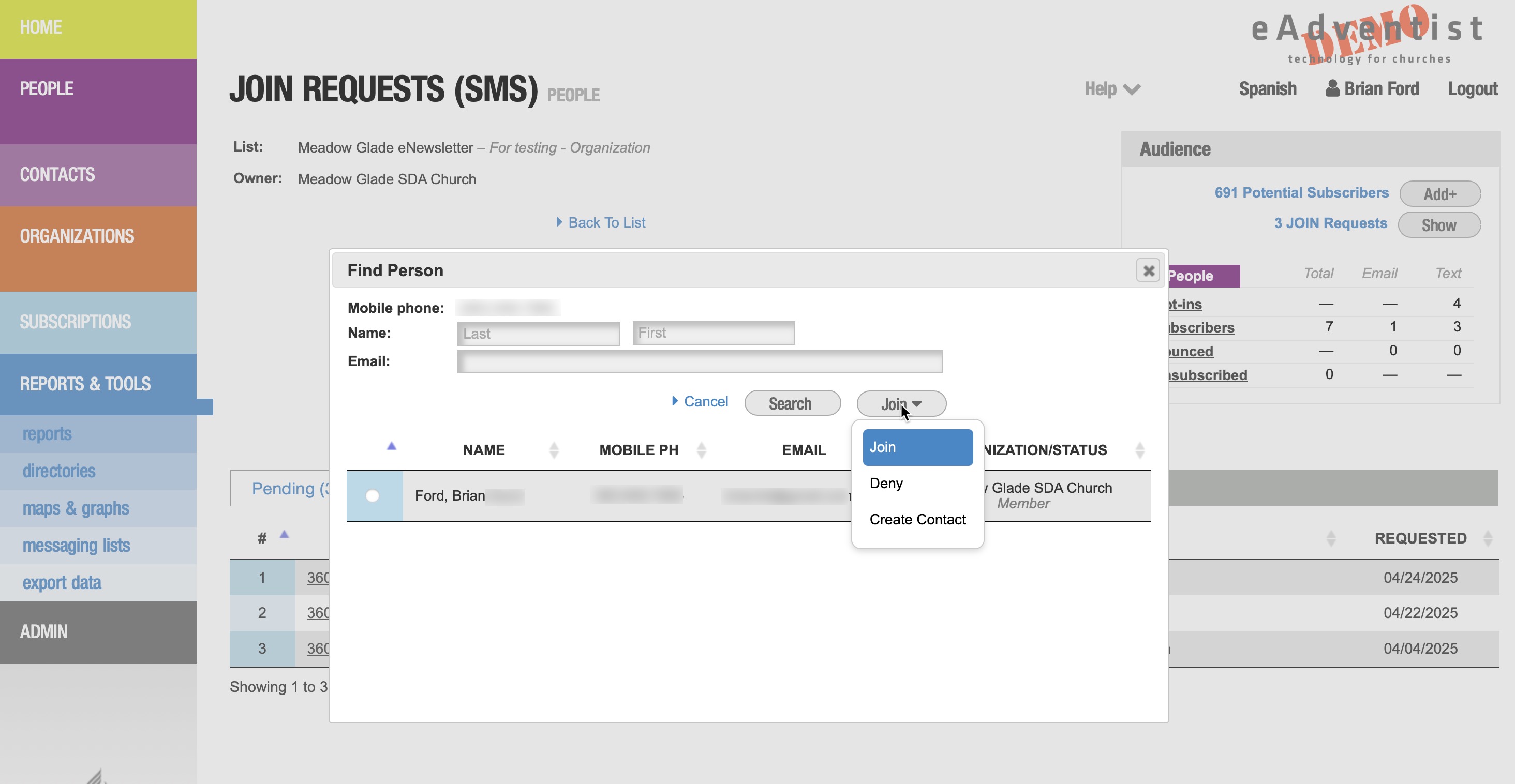 If no match is found, eAdventist replies with a link to add their name and email. This information is saved in JOIN Requests - for you to review and find a matching Person. If you find a match in People, you can select the Person and choose "Join". Otherwise, you can choose "Deny" or "Create Contact".