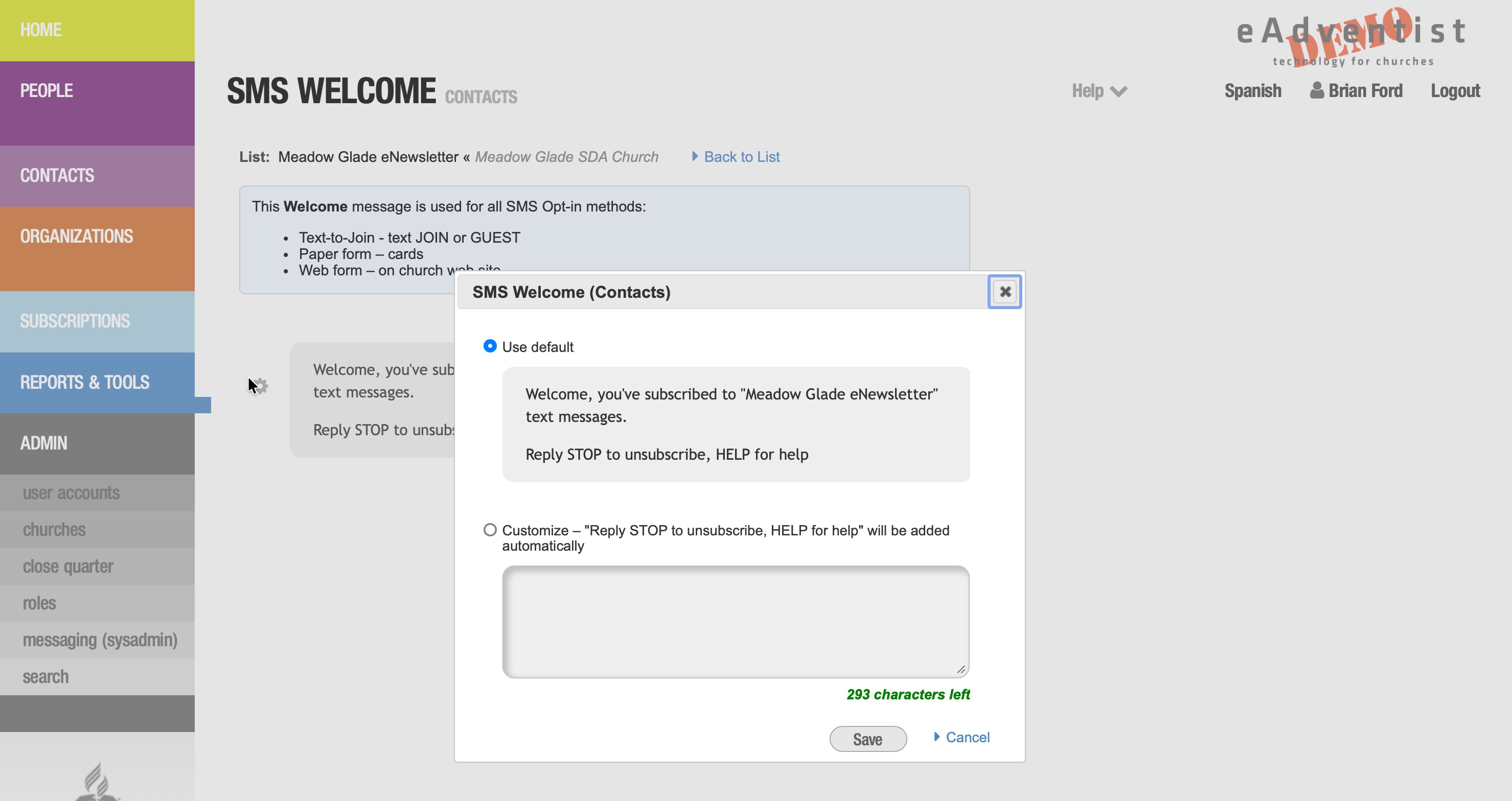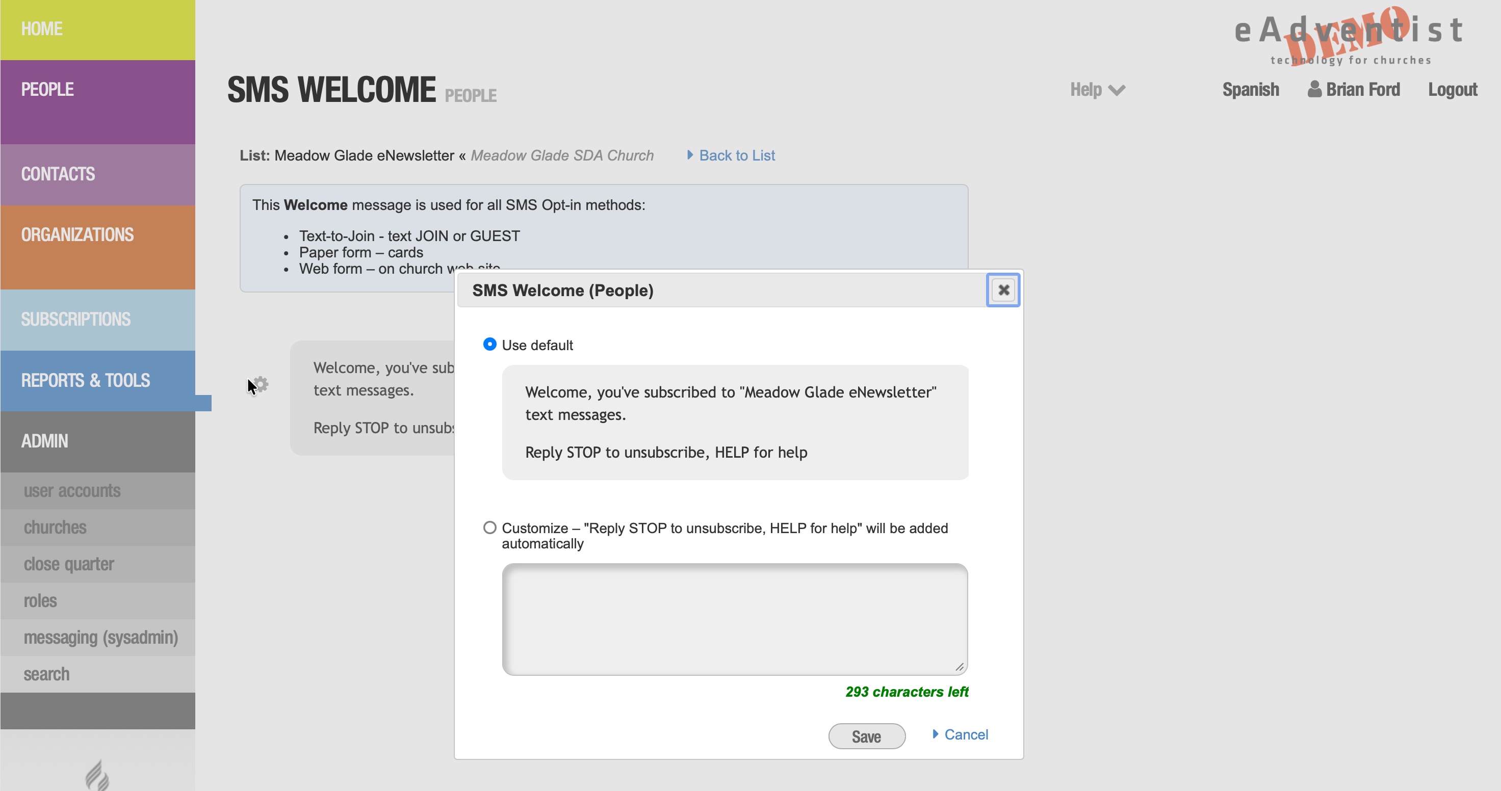 You can customize the SMS Welcome message that People and Contacts will receive when they opt in.